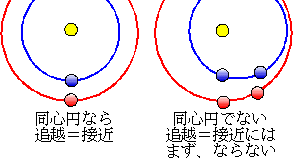 ところで、地球が火星を追い抜く日は4月25日で、距離が一番縮まる(接近する)日は5月2日です。これはどうしたことでしょうか? カンタンにいえば「地球と火星の軌道が同心円ではない」ということが原因となります。同心円なら、追越=接近となりますが、そうでないと下図のように追越と接近がずれるのです。実際、火星や地球の軌道は楕円形であることが知られていて、特に火星はひしゃげ方が大きいのです。