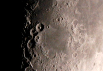 「神酒の海」("神酒"とは、不老不死の妙薬「ネクタル」のこと) に隣接する「テオフィルス」クレーターは直径が100km(大阪−名古屋ぐらい)あります。 ふちの高さは6km(富士山の2倍ぐらい)!です。中央にはセントラル・ピークがそびえています。 南隣には「キュリッロス(キリルス)」クレーター、そのまた南隣には「カタリーナ」があります。 これらのクレーターを取り囲むようにして「アルタイ断崖」が400kmにわたって伸びています。 月の地形は小さいように見えて、結構、大きいんです。