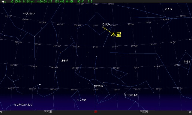 木星、新赤斑成長中!太陽系最大の惑星・木星には「大赤斑」と呼ばれる赤い大きな渦があります。その木星に、新たな赤い渦が誕生し、成長しているらしく、アメリカ航空宇宙局NASAの研究者は「Red Jr.(赤斑ジュニア)」というニックネームで呼んでいます。 "赤斑ジュニア"の大きさは大赤斑の半分くらいで、もともとは3つの小さな渦が2000年に合体したものです。 昨年までは白っぽかったものが、最近、赤くなってきたようです。 大赤斑にしろ、赤斑ジュニアにしろ、なぜ赤っぽい色をしているのかはよく分かっていません。 渦の底部からなんらかの物質が巻き上げられて、太陽の紫外線によって化学変化をしているのではないか、と考えられています。 大赤斑も何世紀も前にいくつかの渦が合体して大きくなったことが分かっています (近年は大赤斑が誕生した時よりも小さく色も淡くなってきています)。 赤斑ジュニアの今後の"成長"が楽しみです。 木星は2006年3月現在、てんびん座領域にあり、明け方南の空で明るく見えています。