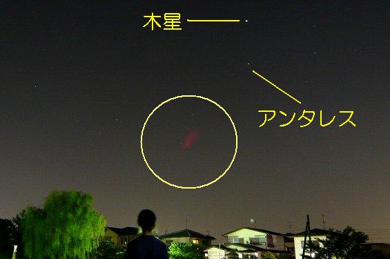 19:27ころ、木星やさそり座のアンタレスのある南南西の空に一筋の光が南西方向に走ったかと思うと、 赤い丸い広がりが見えました。 赤い雲はすぐに左下方向に伸び、ほうき星のような形になりました。 リチウム放出は40秒間隔で3回行なうことになっていましたが、撮影地である生駒からは、1回目しか確認できませんでした。 赤いリチウム雲はじょじょに広がりながら暗くなり、数分後には見えなくなりました。 ●撮影データ
